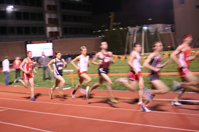 Here is some catch-up info: Corey had an OK race on Friday night at Princeton. He was disappointed with his time, but his coach was thrilled that he was feeling like racing so soon after getting over mono. And considering Corey's past and current health and his level of training, he did just fine. Here is a blurry photo from the race (tough to take good photos of runners at night!!). Corey is the 5th from the right~can you see his new haircut?!
